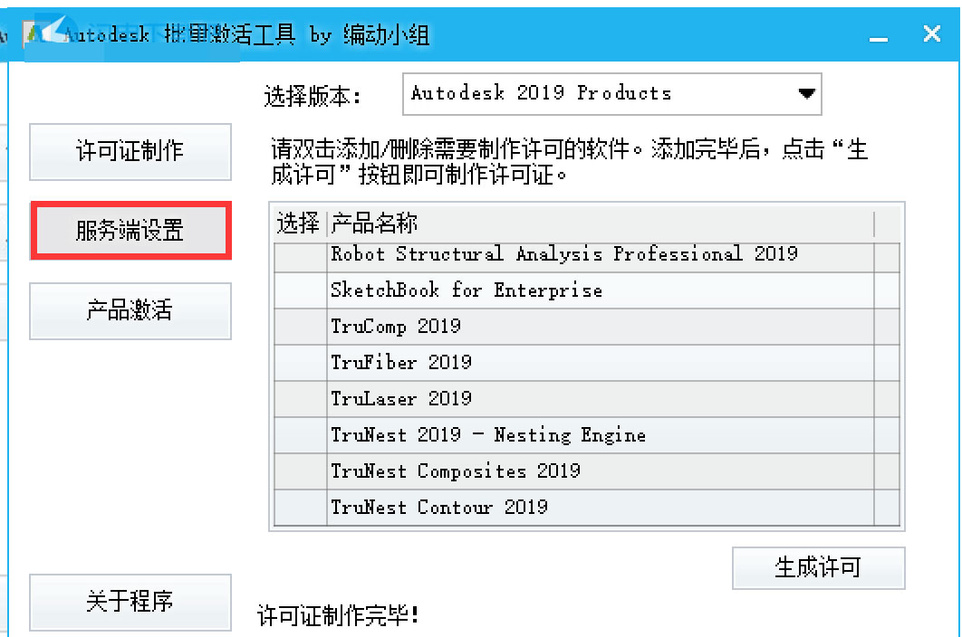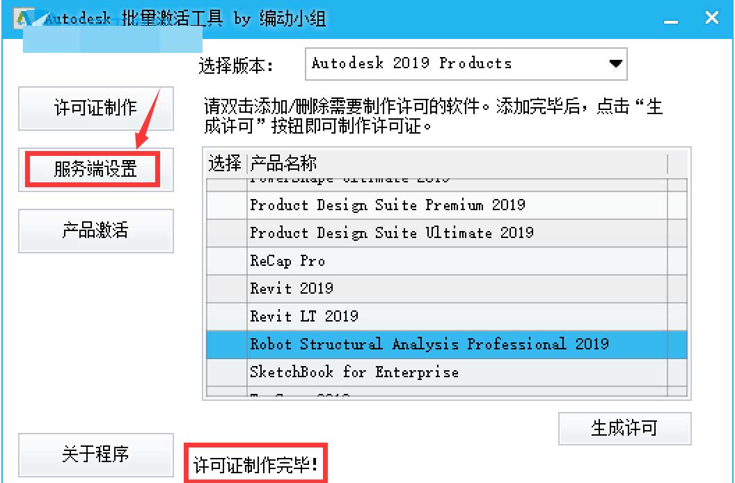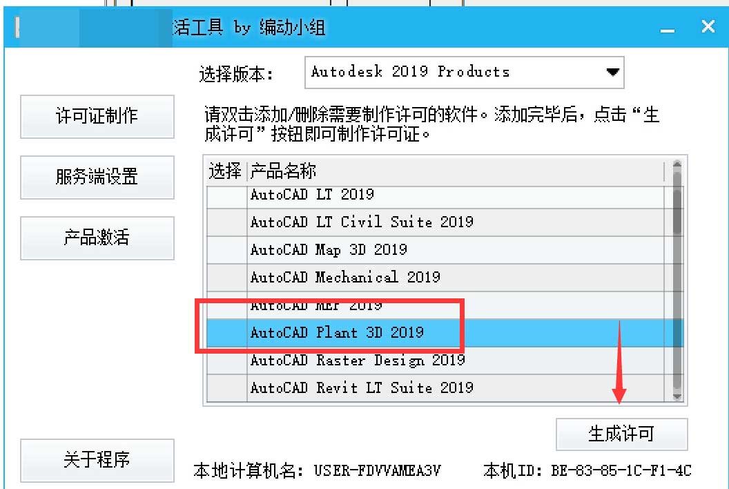 11.運行批量激活工具,勾選需要激活的軟件包AutoCAD plant 3D 2019,點“生成許可”。