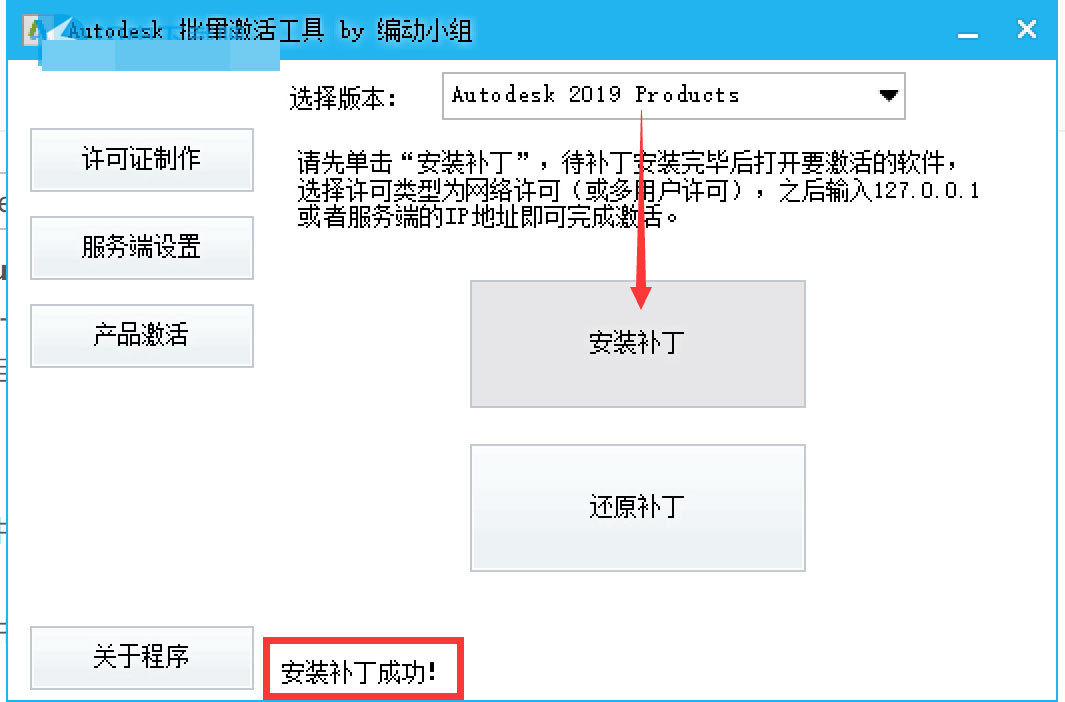 13.進入“產品激活”,選擇要安裝補丁的版本,點“安裝補丁”。