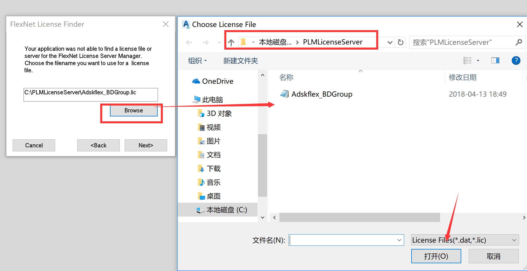 17.點擊“browse”選擇許可文件位置,就是你要c盤創建的“PLMLicenseServer”文件夾中的“Adskflex_BDGroup.lic”文件;