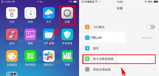 1、打開手機【設置】菜單,打開后點擊【雙卡與移動網絡】選項。