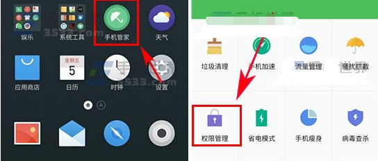 1、先找到手機自帶的【手機管家】應用并打開,進入后再點擊打開【權限管理】。