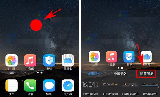 1、首先在桌面空白處長按,長按后就會進入桌面編輯模式,點擊下方的【隱藏圖標】。