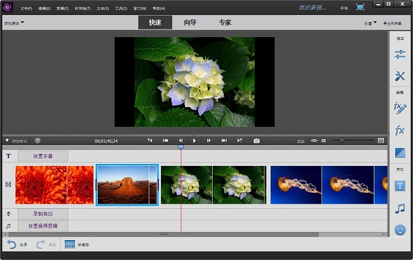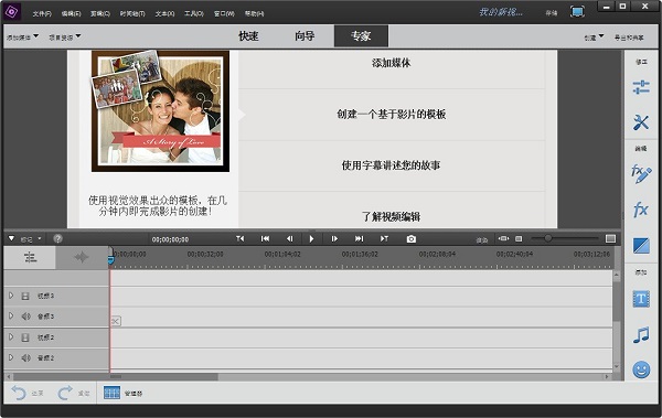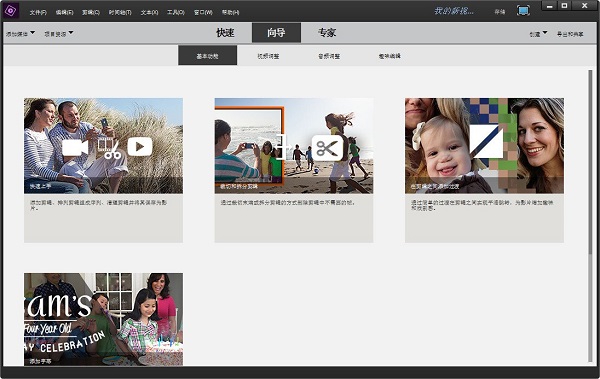 Adobe Premiere Elements 2018 擁有快速、向導和專家三種工作模式,通過這三種向導模式可以引導用戶按順序完成一系列步驟,從而輕松完成影片的編輯工作,幫助用戶將視頻剪輯變?yōu)榻涍^專業(yè)編輯的影片。